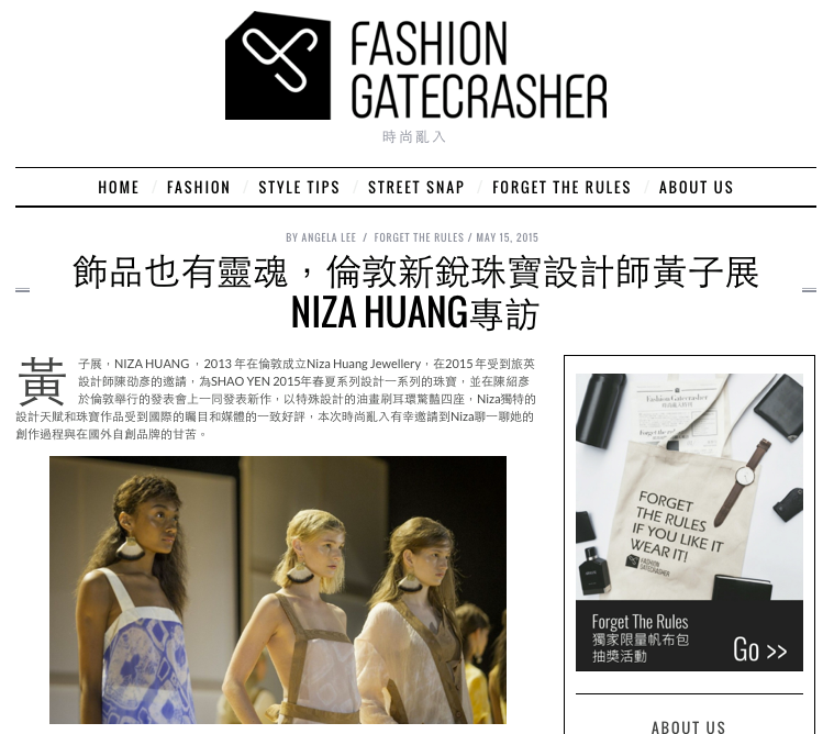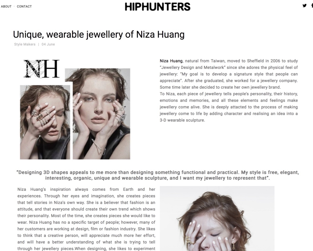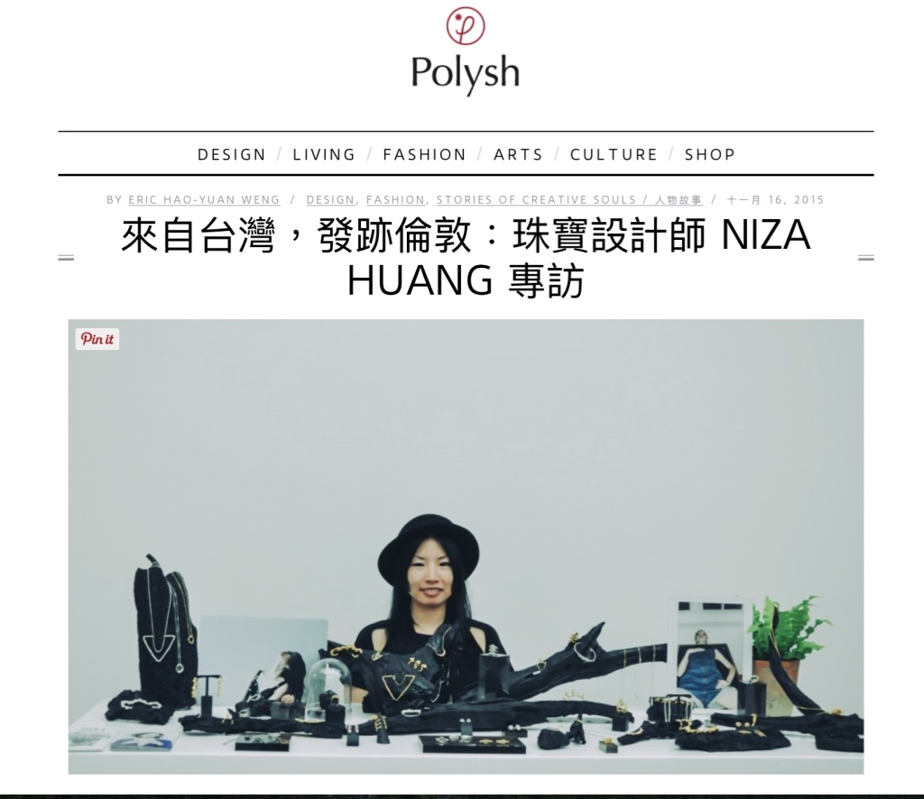 於英國取得珠寶設計碩士的旅英新銳珠寶設計師Niza Huang,於2012年在倫敦成立其同名品牌NizaHuang Jewellery,其飾品更登上倫敦時裝週參展並被選為百大設計師品牌進軍義大利。運用前衛的輪廓造型與天然礦寶石輔以手工雕塑,Niza Huang堅持使用純銀金屬與天然礦物作為素材,並完整保留礦物原始形體,將哲學思維與自身對藝術的熱愛注入作品當中,打造出獨具強烈個性的飾品風格,獲得Elle、Vogue、Another Magazine等歐美頂尖雜誌高度關注。
