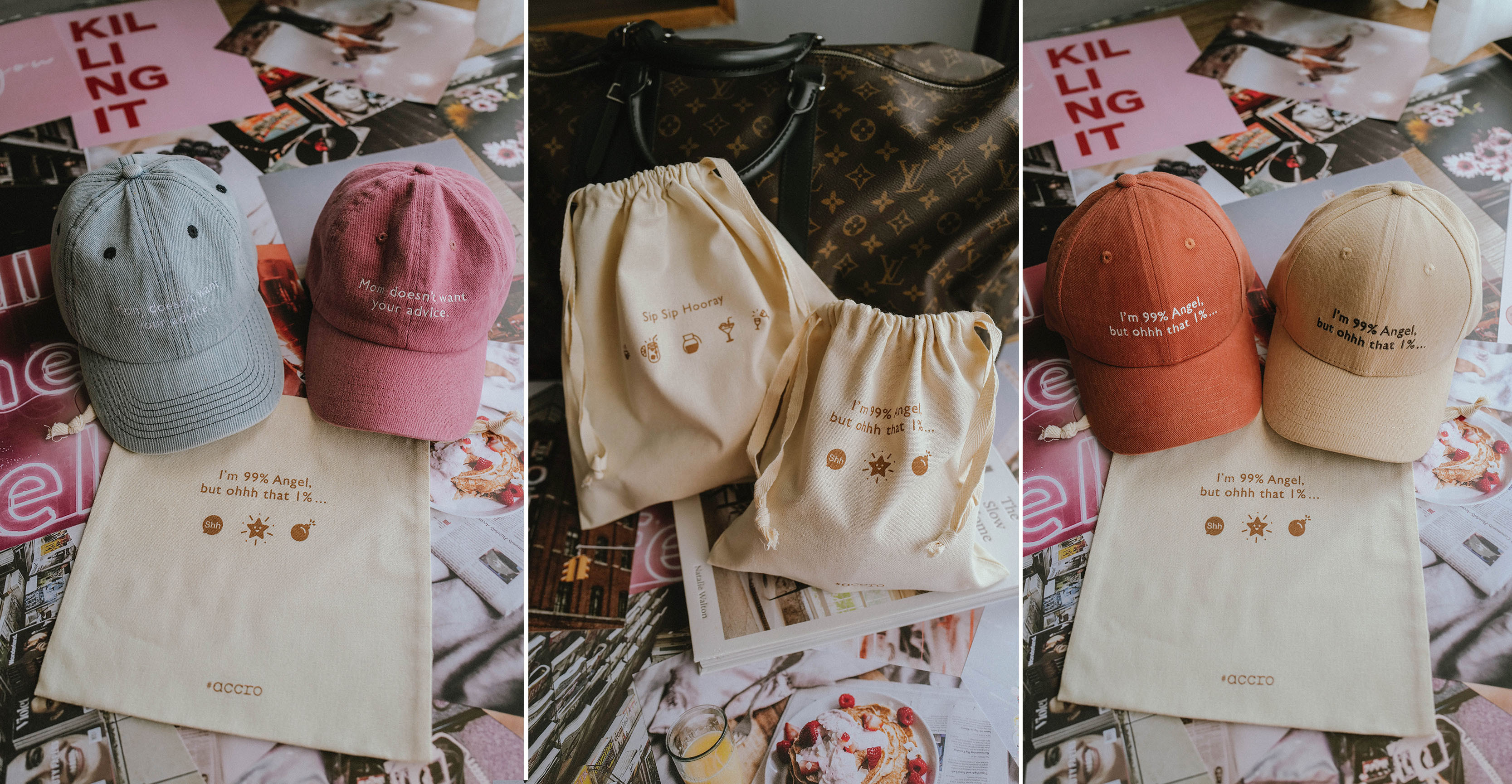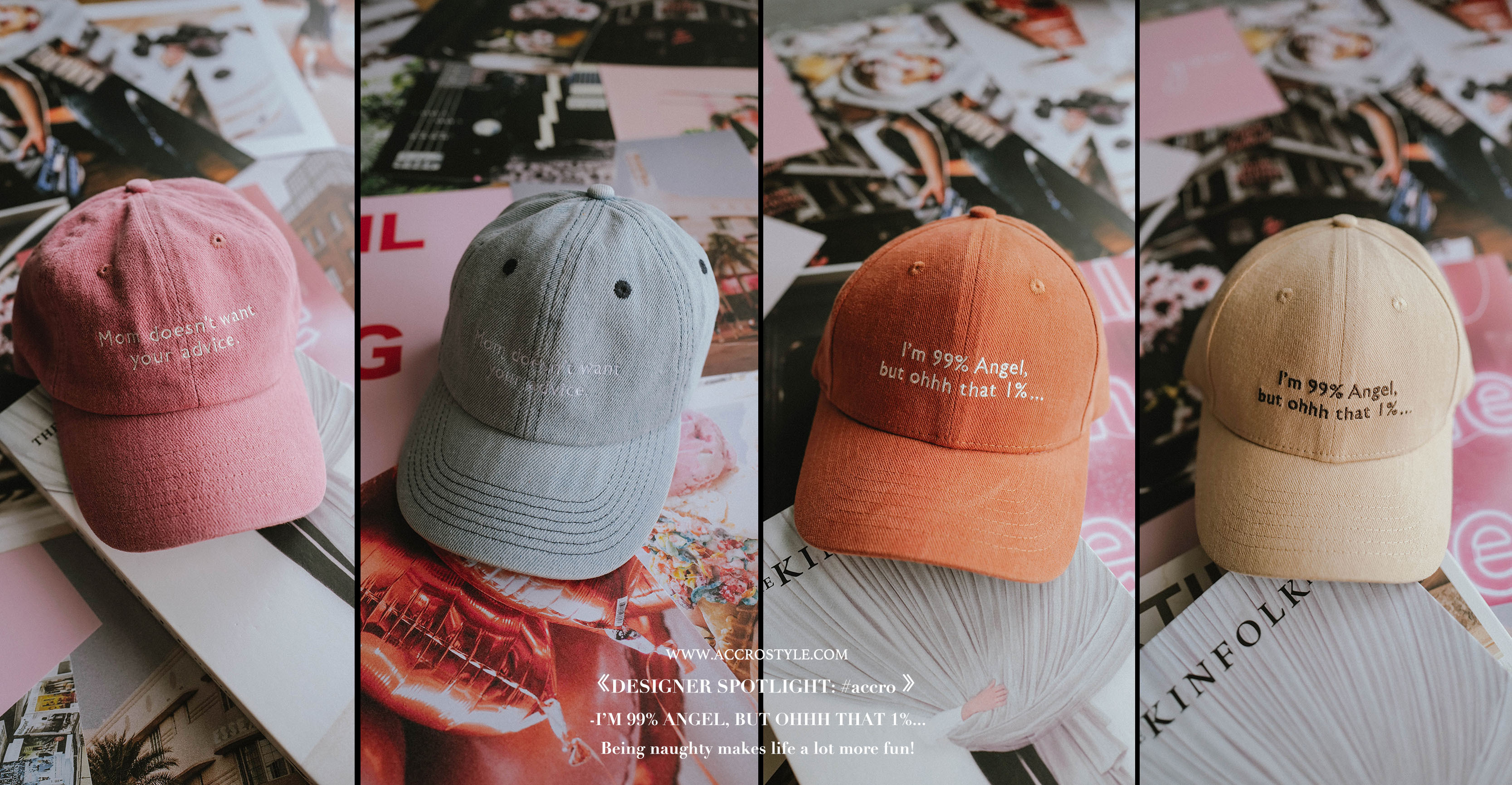 棒球帽前後以平繡繡花工法,繡出精緻的俏皮語及設計圖案,#accro品牌logo更特意採與帽身相同顏色,低調不張揚地隱身於老帽之中。