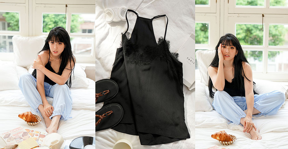 舒適親膚的100% Mulberry Silk桑蠶絲真絲法式蕾絲細肩帶,配上細緻的法式睫毛蕾絲,迷人的法式性感可單穿可內搭,完美到24小時都想穿著不脫下。