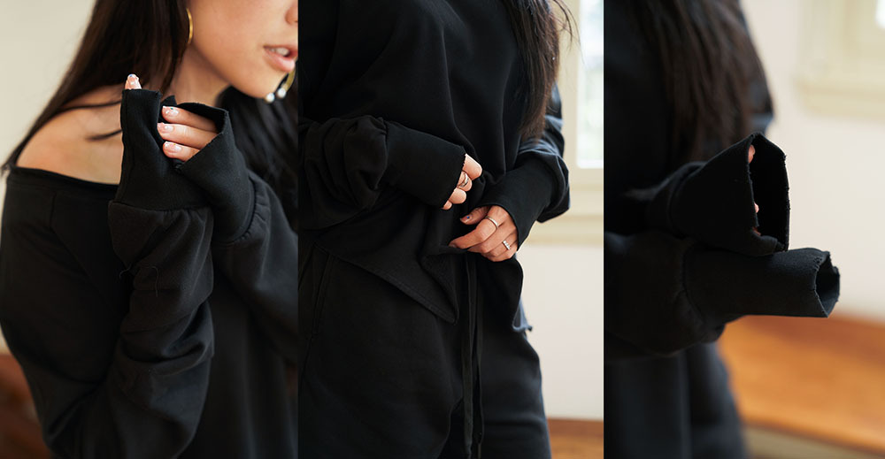 寬鬆領口、超長袖長、單邊開衩下擺皆藏著修飾身形的巧思設計/