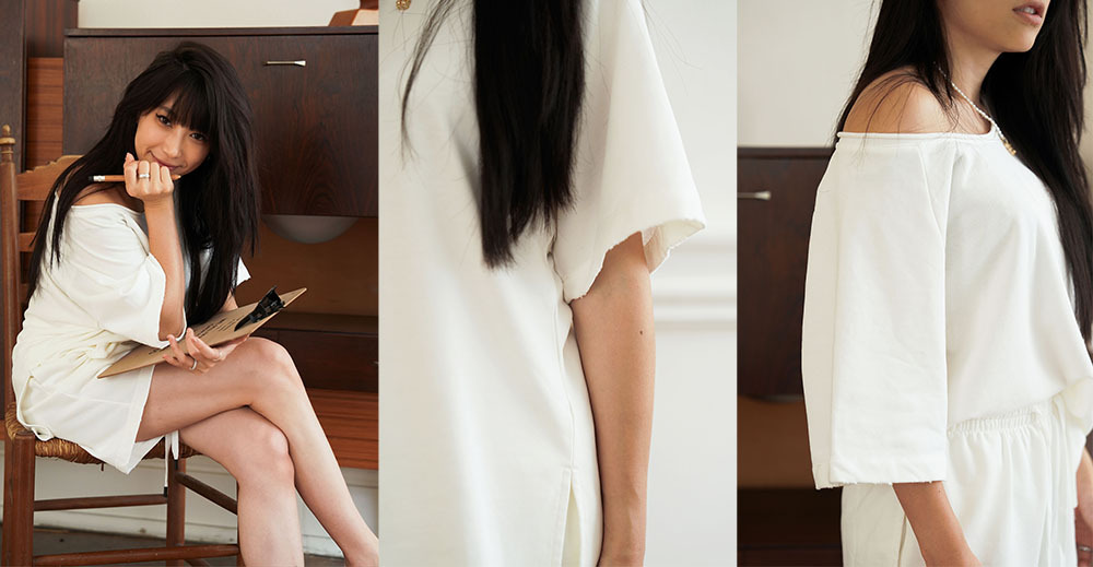 寬鬆領口、五分袖長、雙邊開衩下擺皆藏著修飾身形的巧思設計/